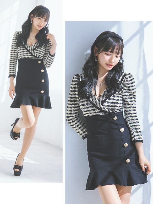 [韓国ドレス] 袖あり 八部袖 テーラードカラー パイピング チェック柄 裾フリル タイトミニドレス (Sサイズ~Lサイズ) (重川茉弥/キャバドレス着用)