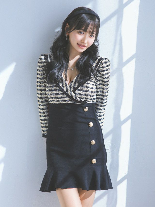 韓国ドレスらしいゴールボタンや裾フリルで