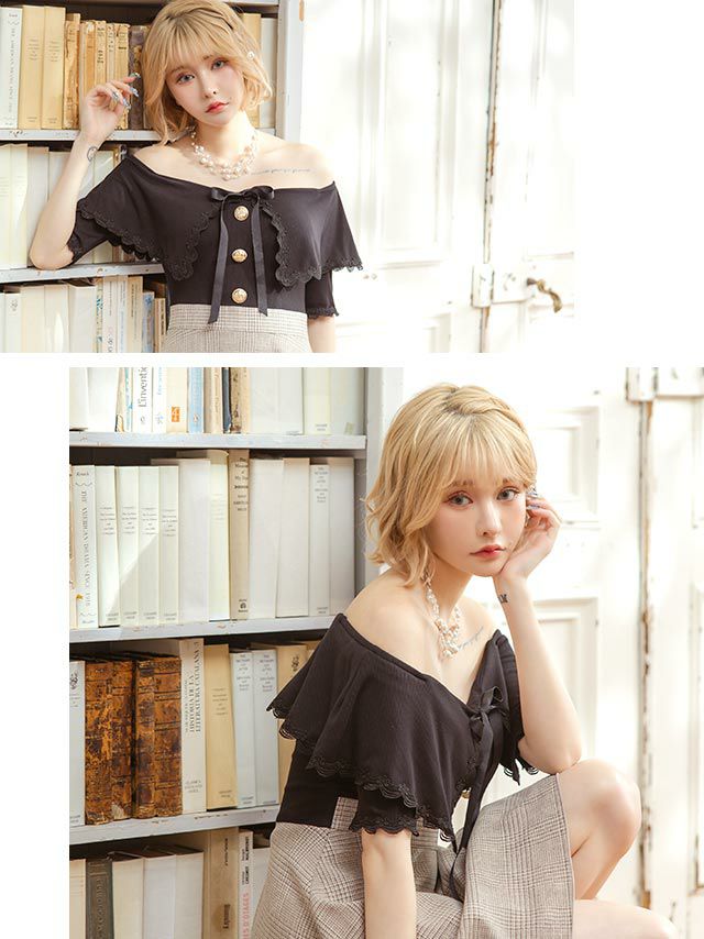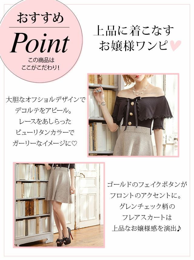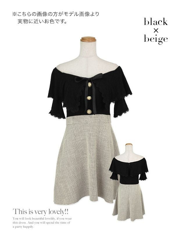 [韓国ドレス] グレンチェック柄フリルリボン袖ありオフショルダーフレアミニドレス (Sサイズ~Lサイズ) (戦慄かなの/キャバドレス着用)