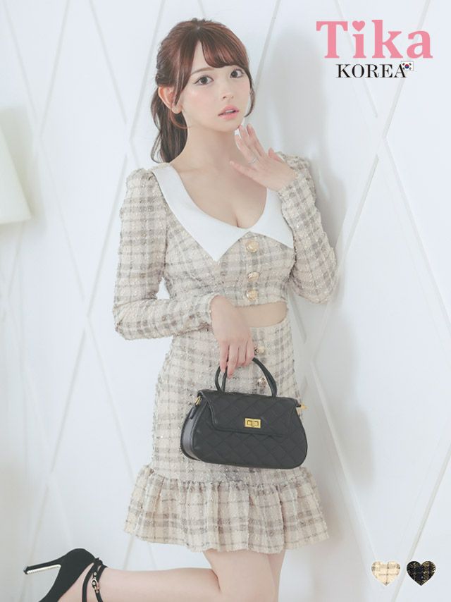 男ウケもしっかり狙えるガーリードレス♪ [韓国ドレス] ワンピース 長袖 襟付き 裾フリル ガーリー チェック柄 Aラインミニ キャバドレス (黒崎みさ着用) [tk-mdk867b]