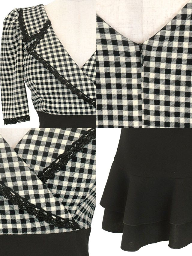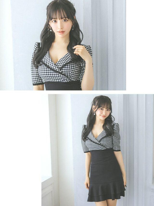 モノトーンカラーで大人ガーリーに♪ [韓国ドレス] 袖あり ギンガムチェック柄 カシュクール 襟付き 裾フリル フレアミニドレス (Sサイズ~Lサイズ) (重川茉弥/キャバドレス着用)