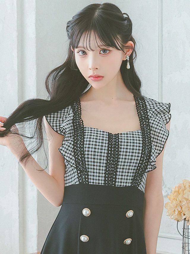 5. [韓国ドレス] ギンガムチェック柄フリル袖レースハイウエスト切替ダブルボタンフレアミニドレス (Sサイズ~Lサイズ) (緩苺/キャバドレス着用)