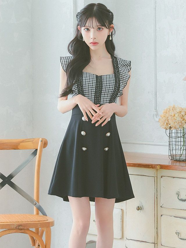 3. [韓国ドレス] ギンガムチェック柄フリル袖レースハイウエスト切替ダブルボタンフレアミニドレス (Sサイズ~Lサイズ) (緩苺/キャバドレス着用)