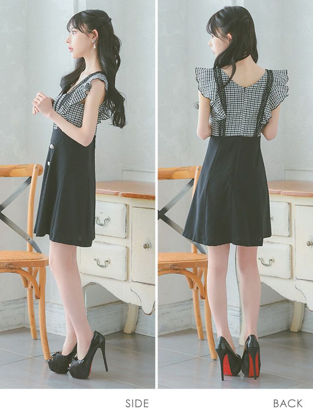 4. [韓国ドレス] ギンガムチェック柄フリル袖レースハイウエスト切替ダブルボタンフレアミニドレス (Sサイズ~Lサイズ) (緩苺/キャバドレス着用)
