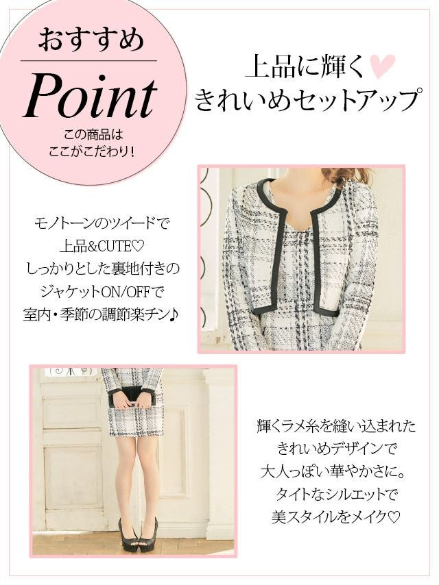 大人可愛いチェック柄のセットアップスーツ♪ モノトーンチェック柄ノーカラーツイードジャケットワンピーススーツ (Sサイズ~XLサイズ) (天使かれん/キャバスーツ着用)