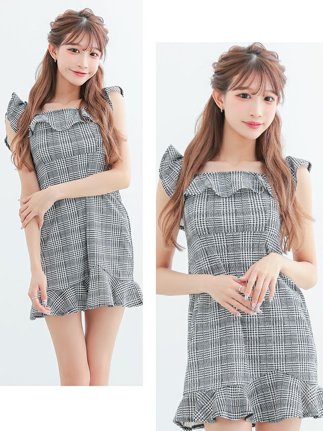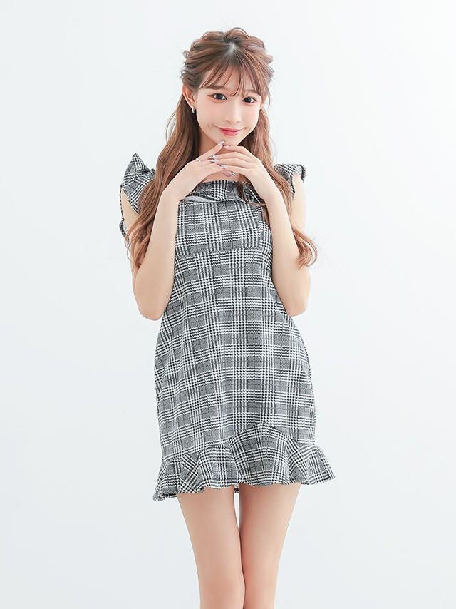 フリルデザインで可愛らしく♪ 千鳥格子柄フリルノースリーブタイトミニドレス (斉藤らな着用)