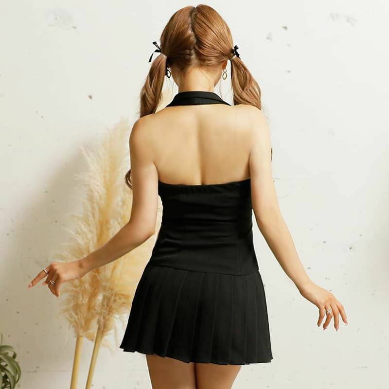 美脚を叶える [PURESS/ピュアレス] 高級ホルターネック襟付きプリーツフレアミニドレス