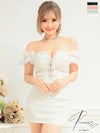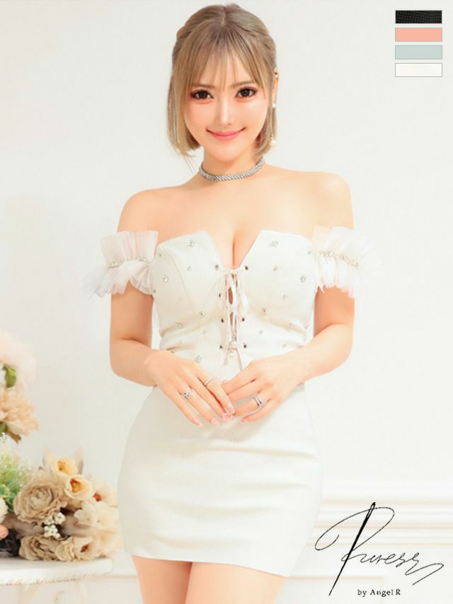 キャバドレス セクシー PURESS ピュアレス 高級レースビジューオフショルダーツイードフロントリボンタイトミニドレス