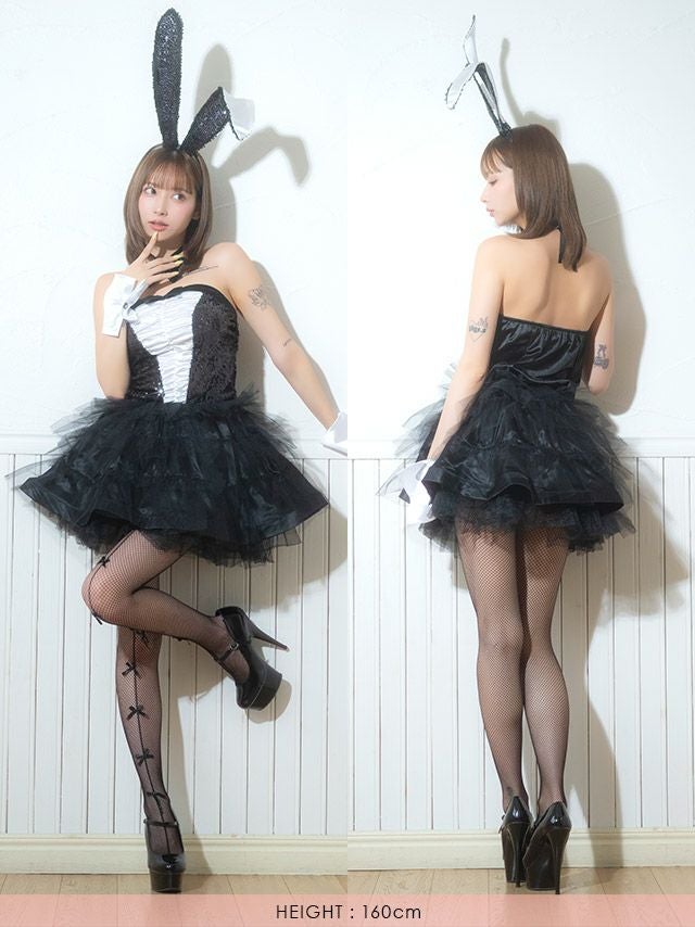 バニー コスプレ キラキラ スパンコール リボン チュール フレアスカート メイド風 ガーリー 4点セットのフロントバック全身