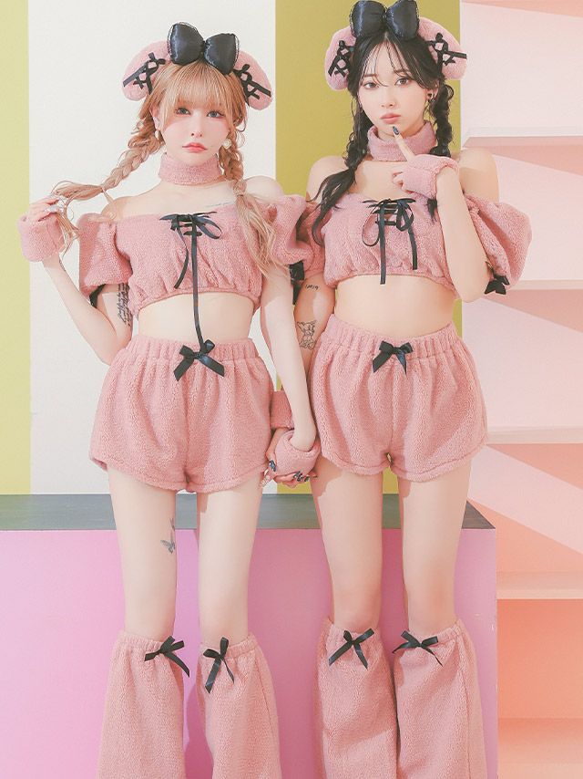 4. [SALE] コスプレ オフショルへそ出しセクシーガーリープードルもこもこリボン犬アニマル [6点セット] (トップス/パンツ/カチューシャ/チョーカー/カフス/レッグカバー)