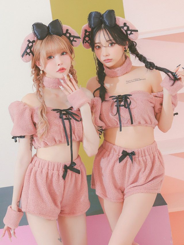 3. [SALE] コスプレ オフショルへそ出しセクシーガーリープードルもこもこリボン犬アニマル [6点セット] (トップス/パンツ/カチューシャ/チョーカー/カフス/レッグカバー)