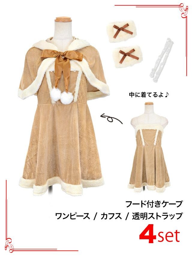 4. サンタコスプレ 4点set トナカイ コスプレ ベア フレアスカート ケープフード アニマル [フード付きケープ+ワンピース+カフス+透明ストラップ]