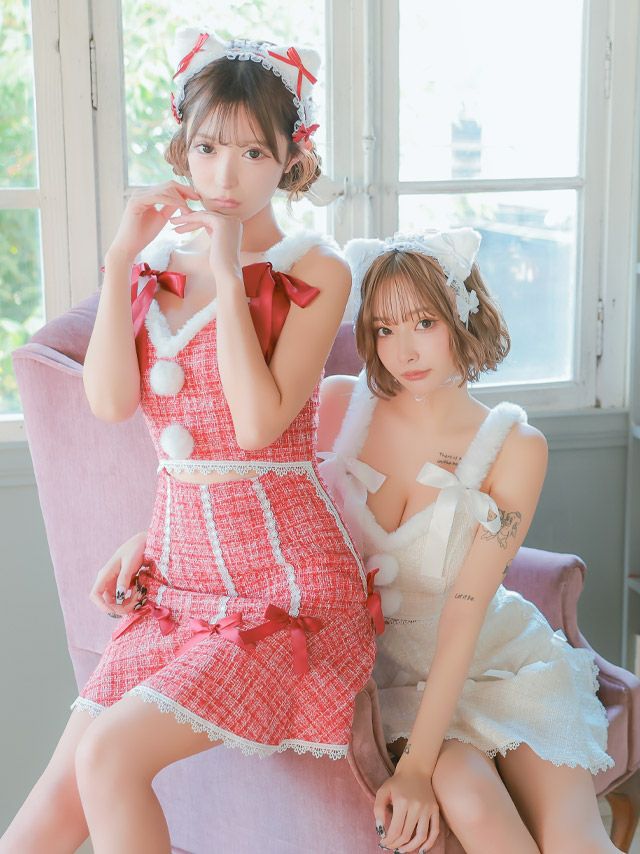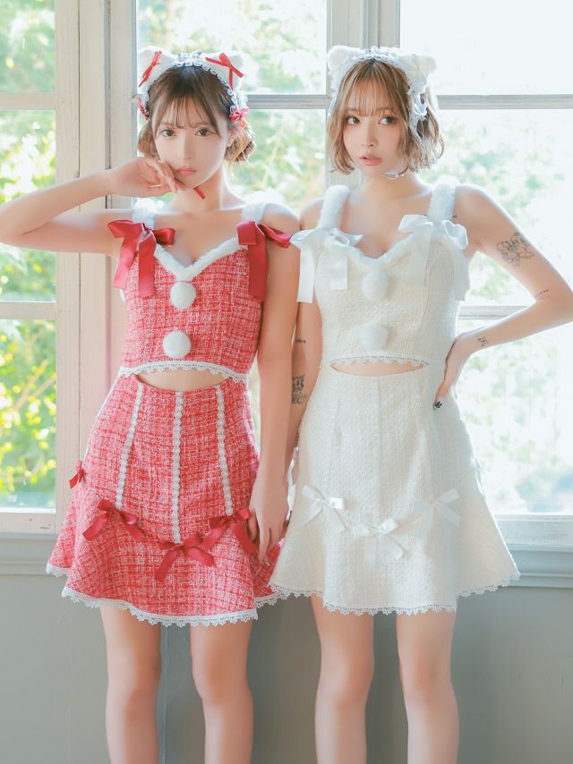 サンタコス 2点set ガーリーサテンリボンツイードミックスレーステープウエストカットフレアスカートペア猫アニマルサンタコスプレドレスのカラーバリエーション