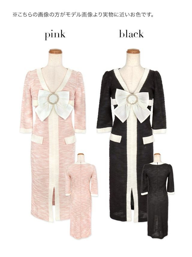ガーリーリボンブローチ付きVネック五部袖ありパイピングデザインフロントスリット膝丈ドレスのカラバリ画像1