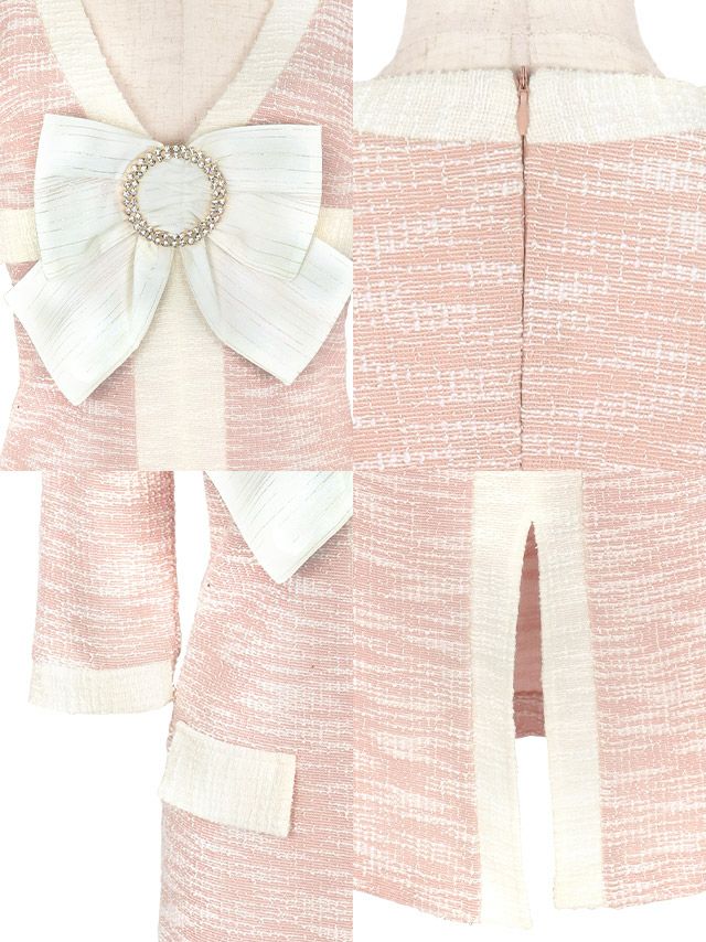 ガーリーリボンブローチ付きVネック五部袖ありパイピングデザインフロントスリット膝丈ドレスの詳細画像2