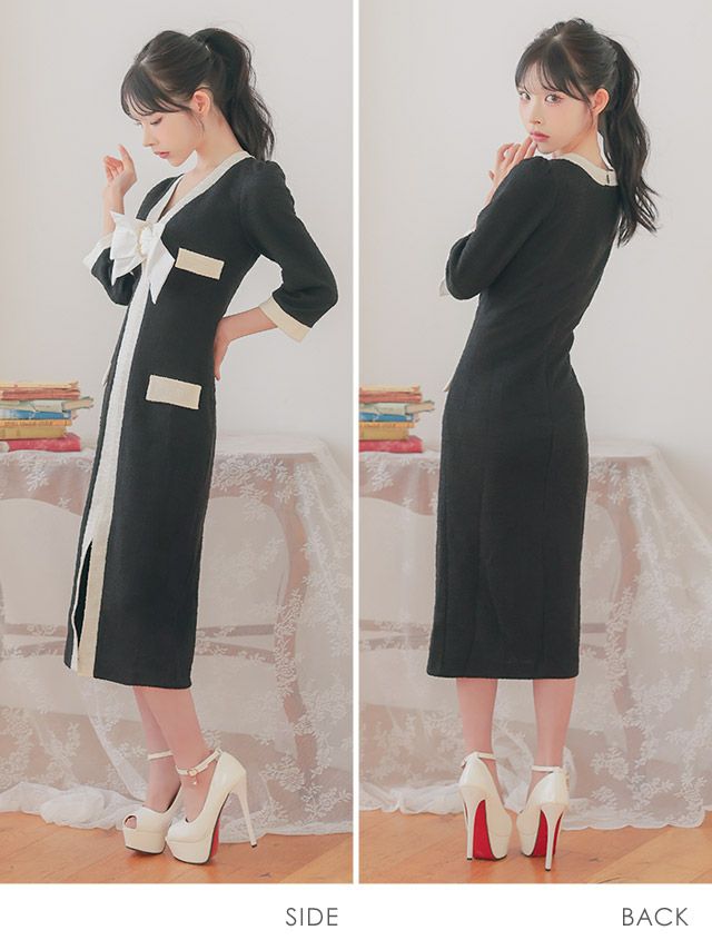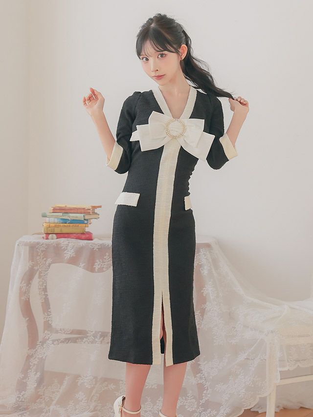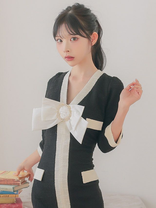 5. [韓国ドレス] ガーリー リボンブローチ付き Vネック 五分袖 袖あり パイピング タイト 膝丈ドレス (Sサイズ~Lサイズ) (PyunA./キャバドレス着用)