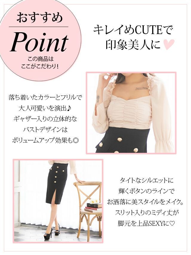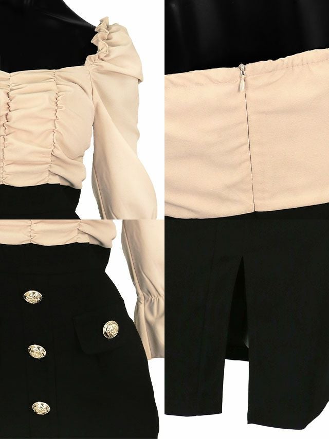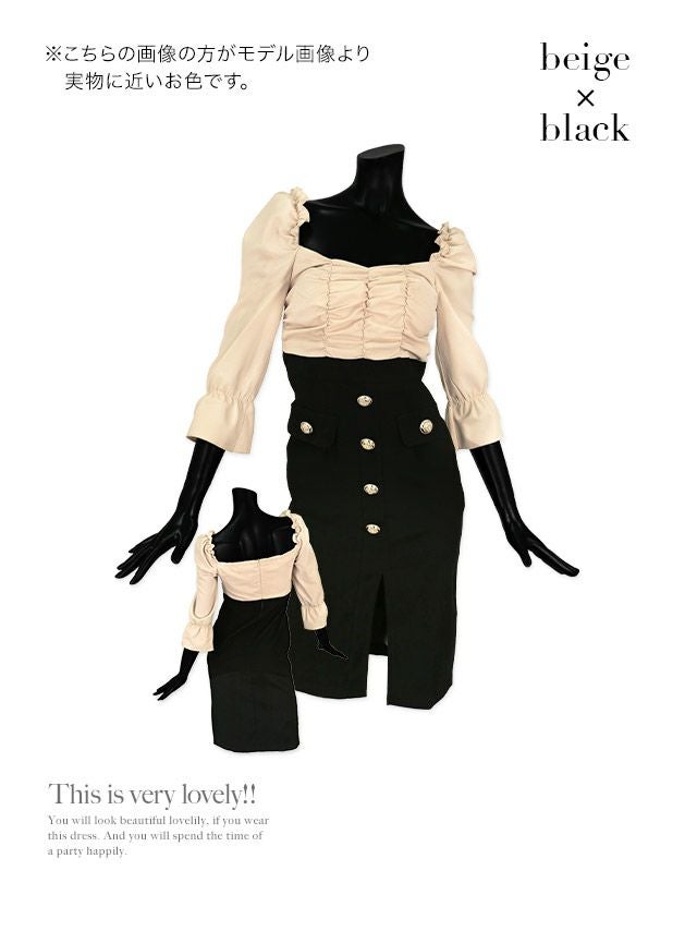 [SALE] 韓国ドレス ハイウエスト切替フリル袖あり膝丈タイトドレス (Sサイズ~Lサイズ) (PyunA./キャバドレス着用)