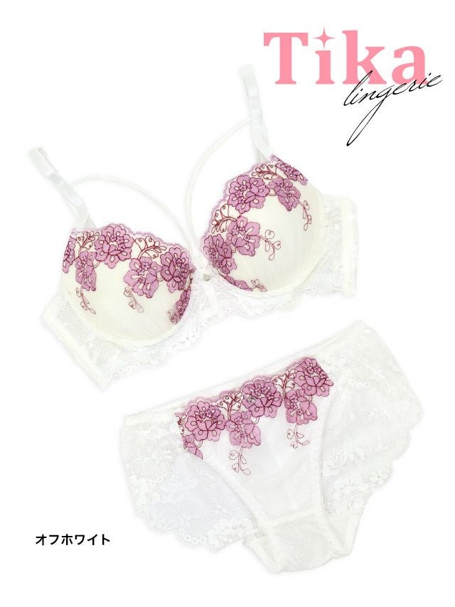 フラワー刺繍ホワイトレースコード脇高カップブラジャー&ショーツ2点セットの詳細画像