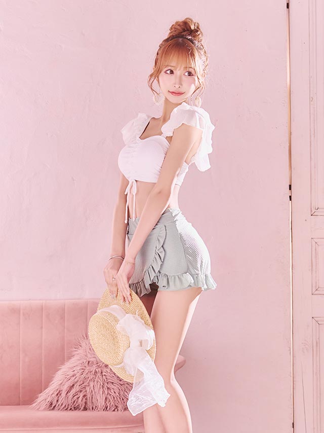3. [水着] ギンガムチェック ビスチェ 袖あり フリル 袖あり インナーパンツスカート 体型カバー 洋服みたいな水着 XLサイズあり 大きいサイズ (浦西ひかる着用) [tk-sw2066]