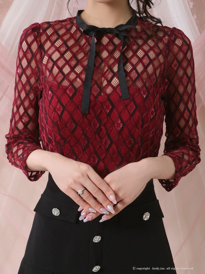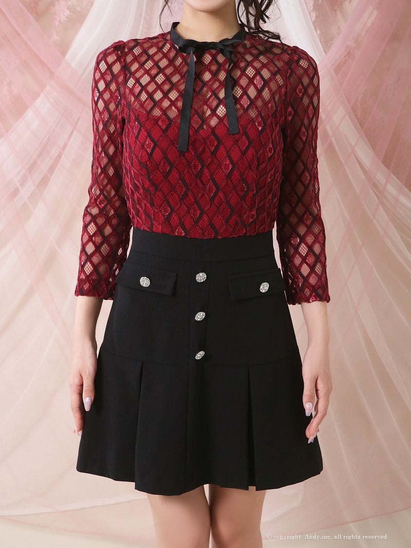 程良い透け感がセクシー♡ [Andy/アンディ] 高級 ブランド Aライン ミニドレス レース 袖あり 七部袖 ネックリボン プリーツスカート ボタン キャバドレス