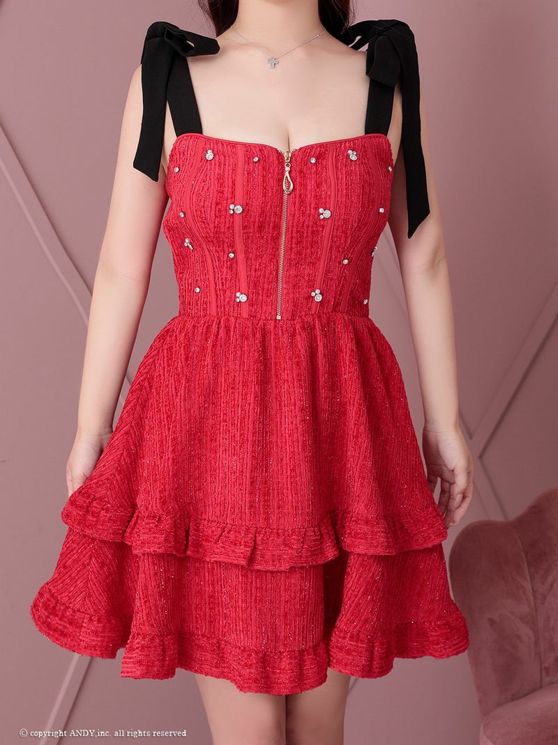 柔らかい雰囲気を演出する♡ [an/アン] 高級 ブランド Aライン ミニドレス 谷間 ノースリーブ ジップ バイカラー フリルスカート ショルダーリボン ビジュー ガーリー