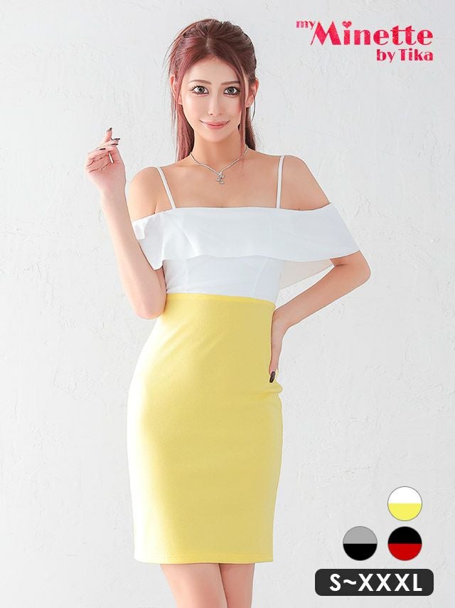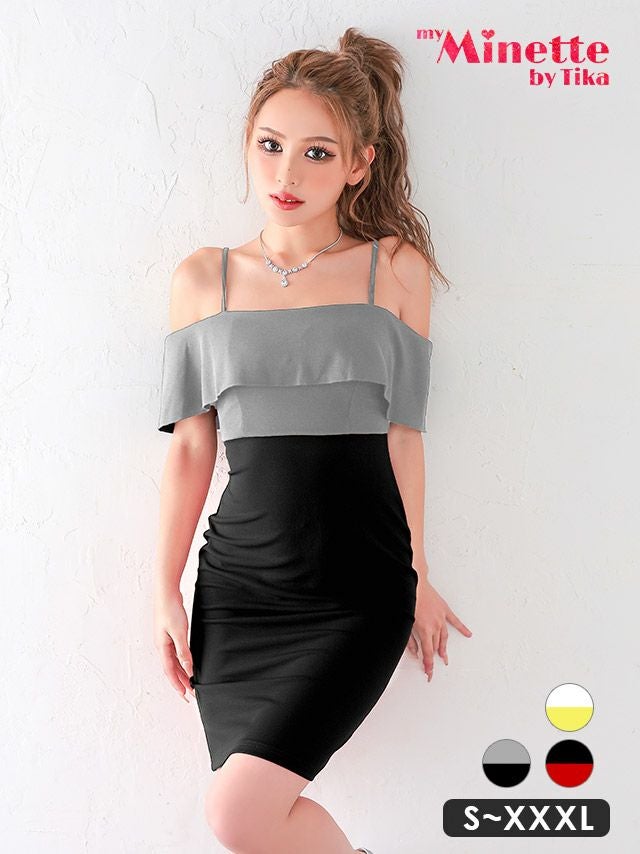 4. 安い タイトミニドレス シンプル 大きいサイズ 大人 上品 肩あき バイカラー プチプラ キャバドレス (みのり着用)