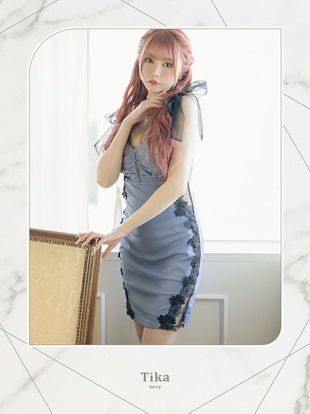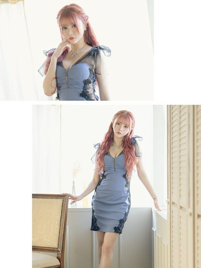 5. シアーノースリーブリボンバストジップ刺繍くびれストレッチタイトミニドレス (Sサイズ~Lサイズ) (PyunA./キャバドレス着用)