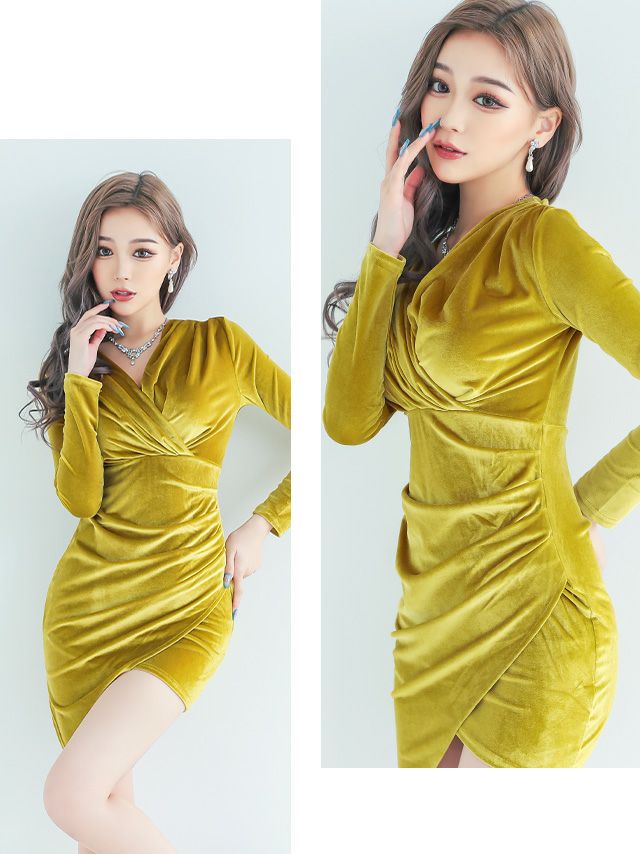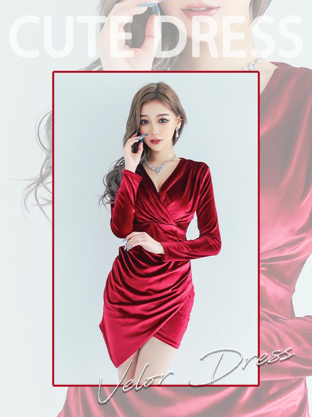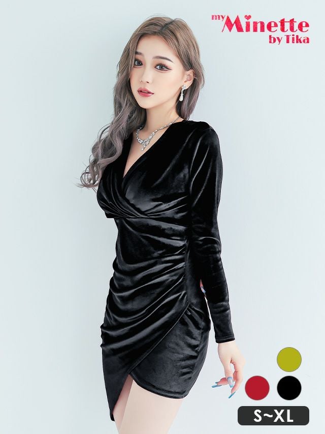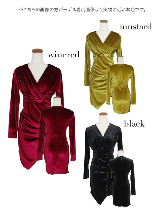 ベロアで高級感漂う♪ ベロアカシュクール風デザイン長袖 袖ありタイトミニプチプラドレス (せいせい着用)