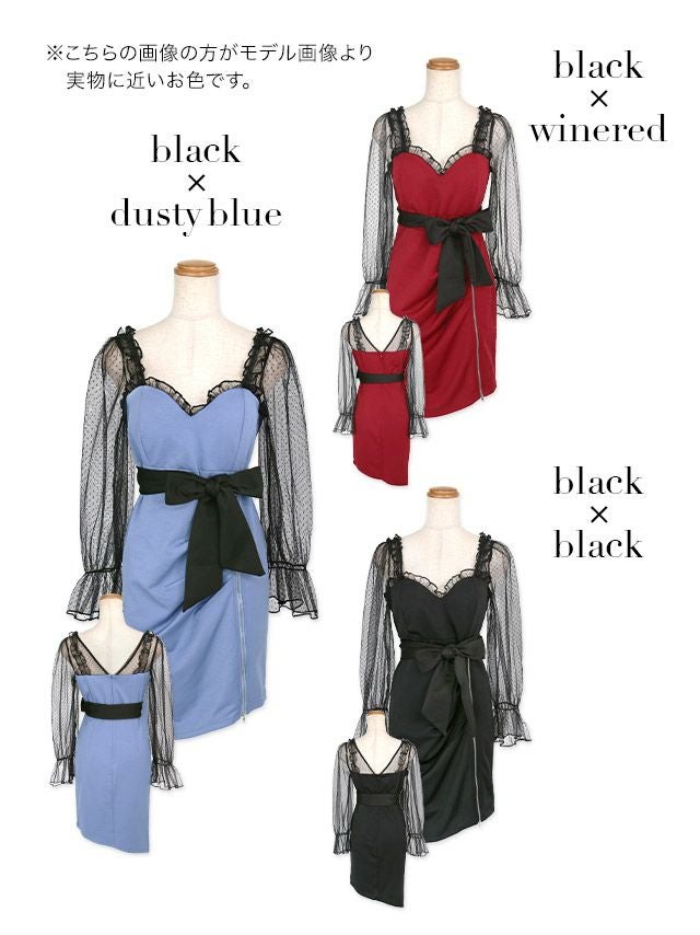 長袖ドットチュールウエストリボンサイドジップタイトミニドレスのカラーバリエーション