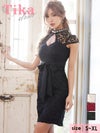 キャバドレス ミディアムドレス 大きいサイズ Tika ティカ 半袖ネックビジューバストカットアウトウエストリボンケミカル総レース膝丈タイトドレス