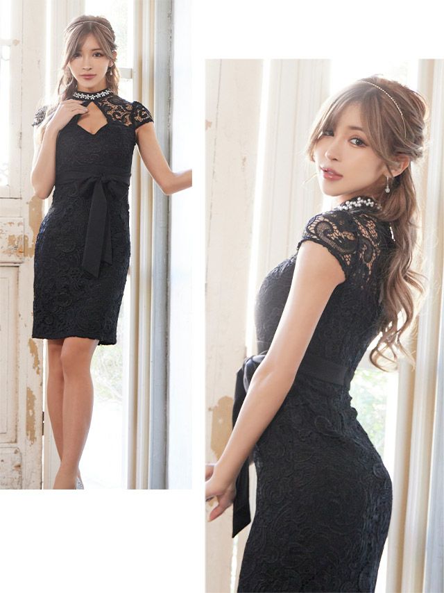 4. 半袖 ネックビジュー バストカット ウエストリボン ケミカル総レース タイト 谷間魅せ 膝丈ドレス (Sサイズ~XLサイズ) (戦慄かなの/キャバドレス着用)