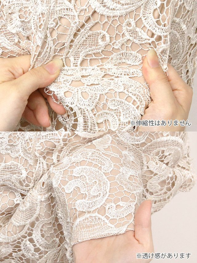 半袖ネックビジューバストカットアウトウエストリボンケミカル総レース膝丈タイトドレスの商品詳細2
