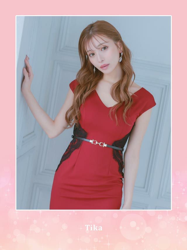 4. 半袖Vネックウエストベルト付きスカラップレースデザインストレッチタイトミニドレス (Sサイズ~XXLサイズ) (みゆう/キャバドレス着用)