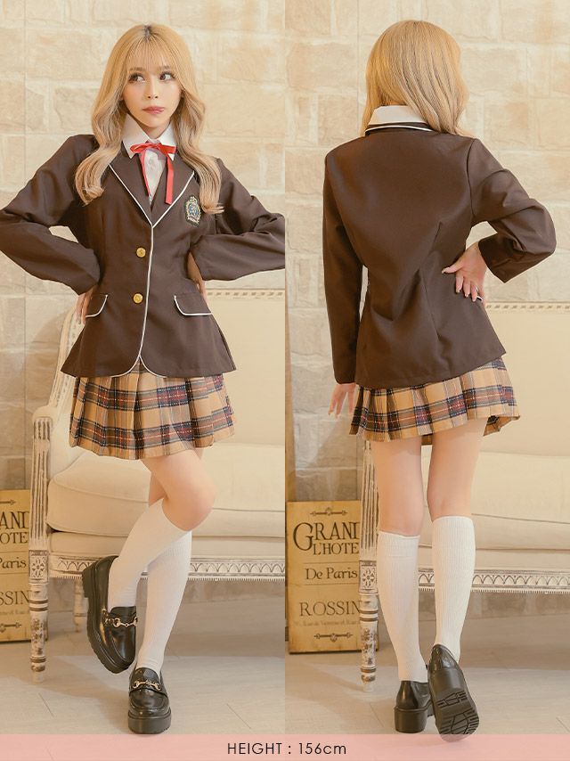 5. [コスプレ] 袖ありパイピングブレザー×プリーツチェックフレアスカートスクールユニフォーム [3点セット] (シャツ付きジャケット/スカート/リボン)