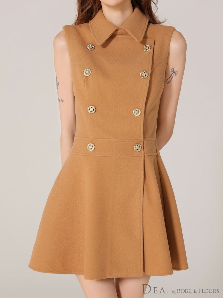 ダブルボタンがお洒落にアクセント♡ [DEA.byROBEdeFLEURS/ディアバイローブドフルール] 高級 ワンカラー ダブルボタン 襟付き ノースリーブ 胸元カバー フレアミニドレス (れむ着用)