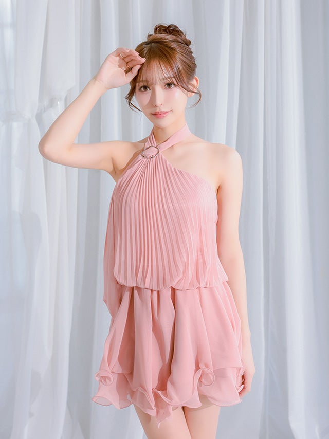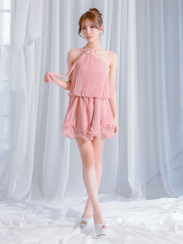 5. [IRMA/イルマ] 高級 ブランド Aラインミニドレス ホルターネック 背中魅せ プリーツ シフォン ティアード フリル (れむ着用)