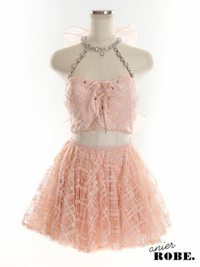 4. [ANIER./アニエル] 高級ビジューバストレースアップセットアップツインへそ出しバニーフレアスカートミニドレス