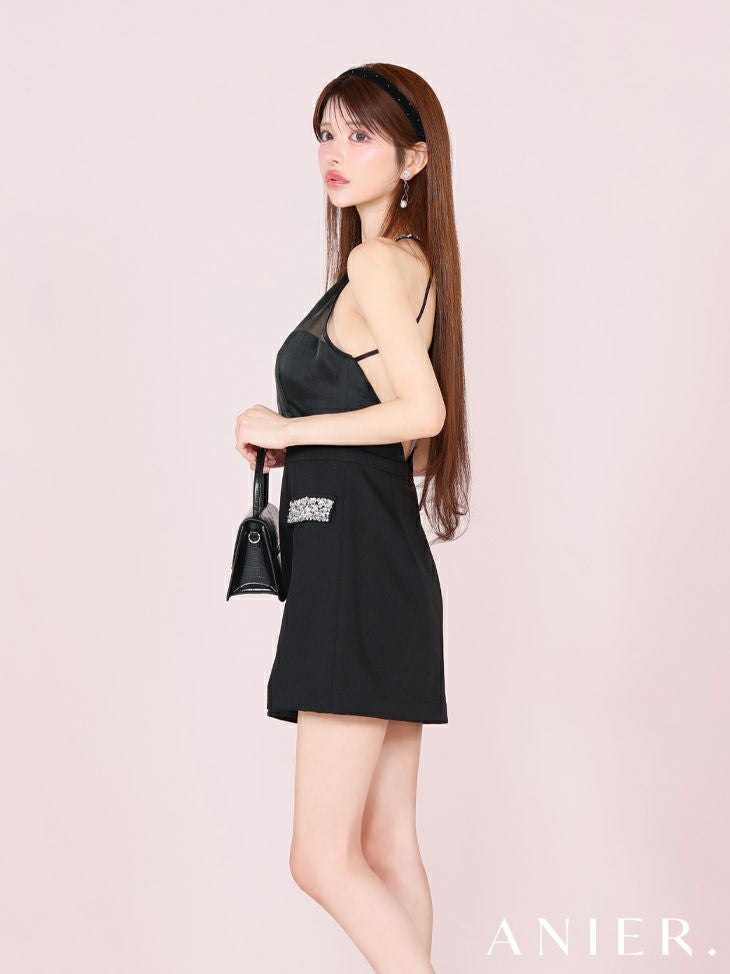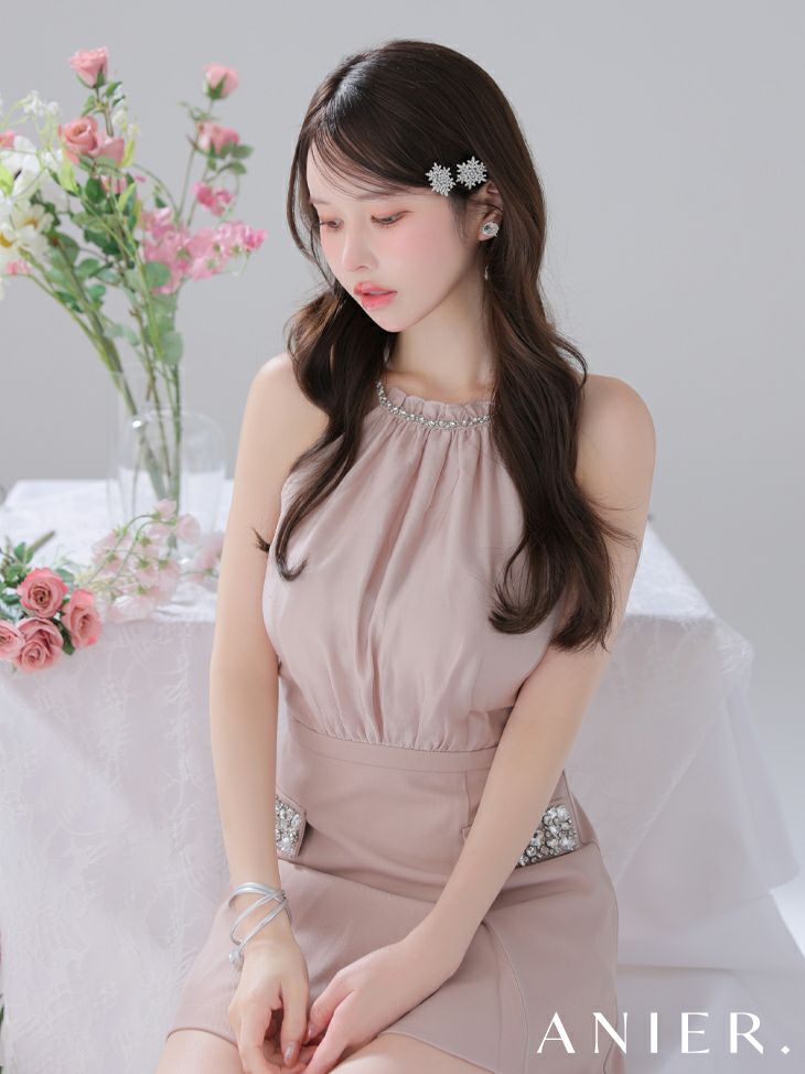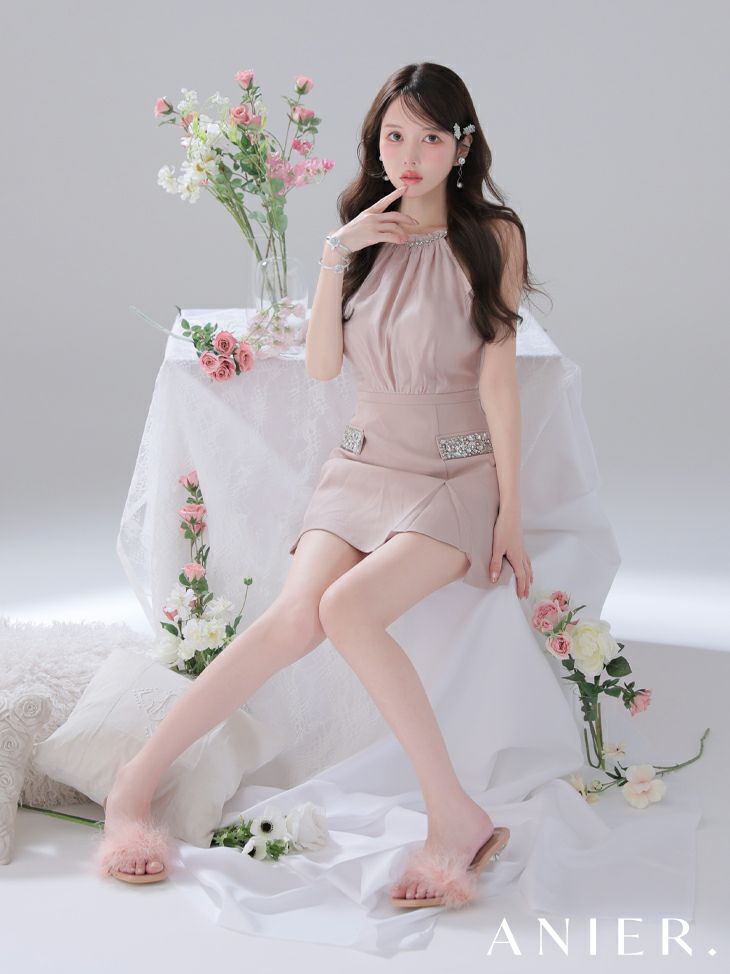 360度可愛く魅せる♡ 予約商品【6月下旬入荷予定】[ANIER./アニエル] 高級 ブランド タイトミニドレス 背中魅せ ホルターネック スリット サテン バストシースルー ビジュー