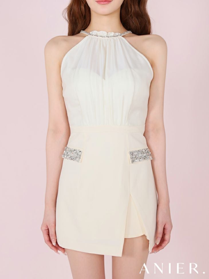 ビジューが煌めく♡ 予約商品【6月下旬入荷予定】[ANIER./アニエル] 高級 ブランド タイトミニドレス 背中魅せ ホルターネック スリット サテン バストシースルー ビジュー