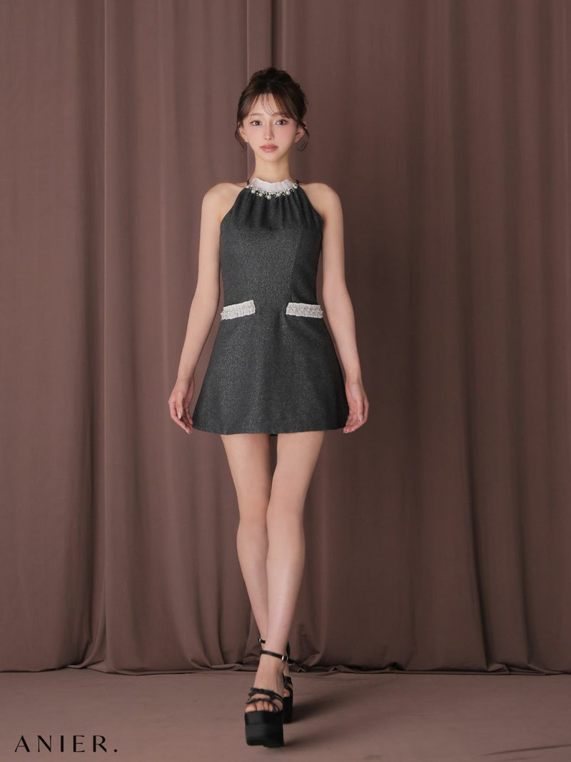 5. [ANIER./アニエル] 高級 ブランド ワンピース Aラインミニドレス ホルターネック パール ラメ ポケット付き 胸元カバー