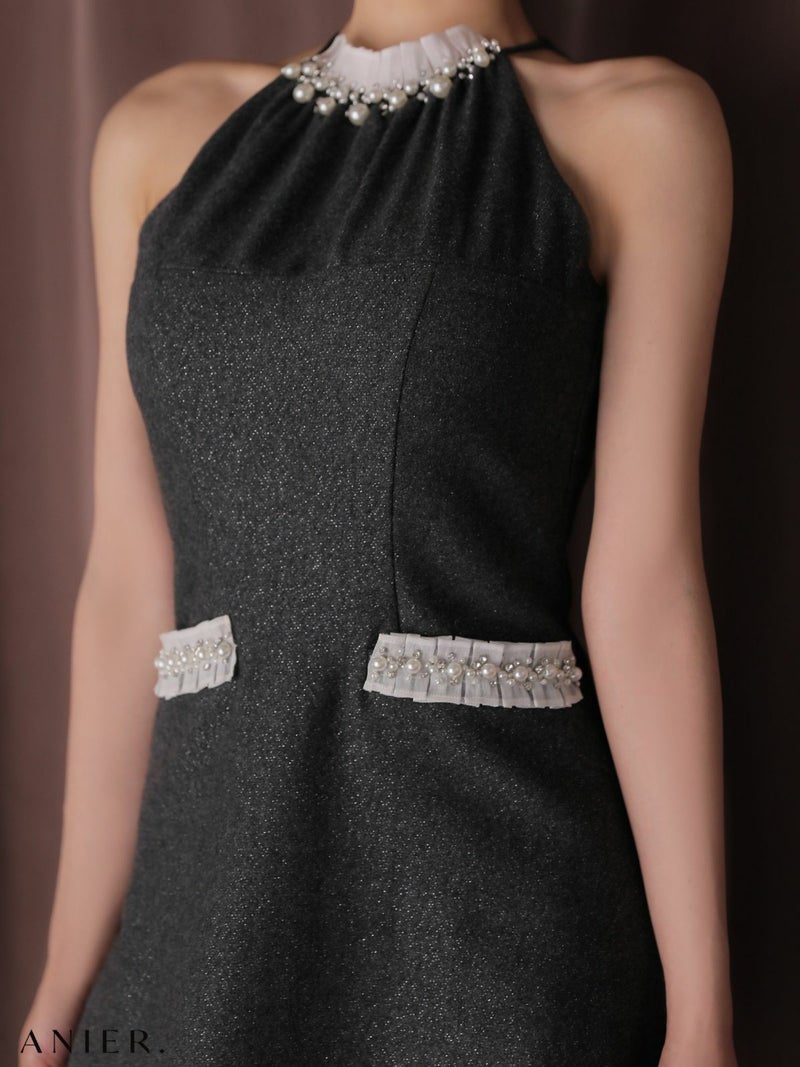 4. [ANIER./アニエル] 高級 ブランド ワンピース Aラインミニドレス ホルターネック パール ラメ ポケット付き 胸元カバー