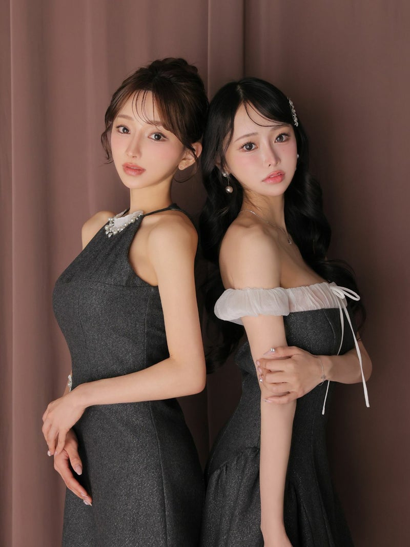 パールが煌めくポケット付き♡ [ANIER./アニエル] 高級 ブランド ワンピース Aラインミニドレス ホルターネック パール ラメ 胸元カバー ポケット付き