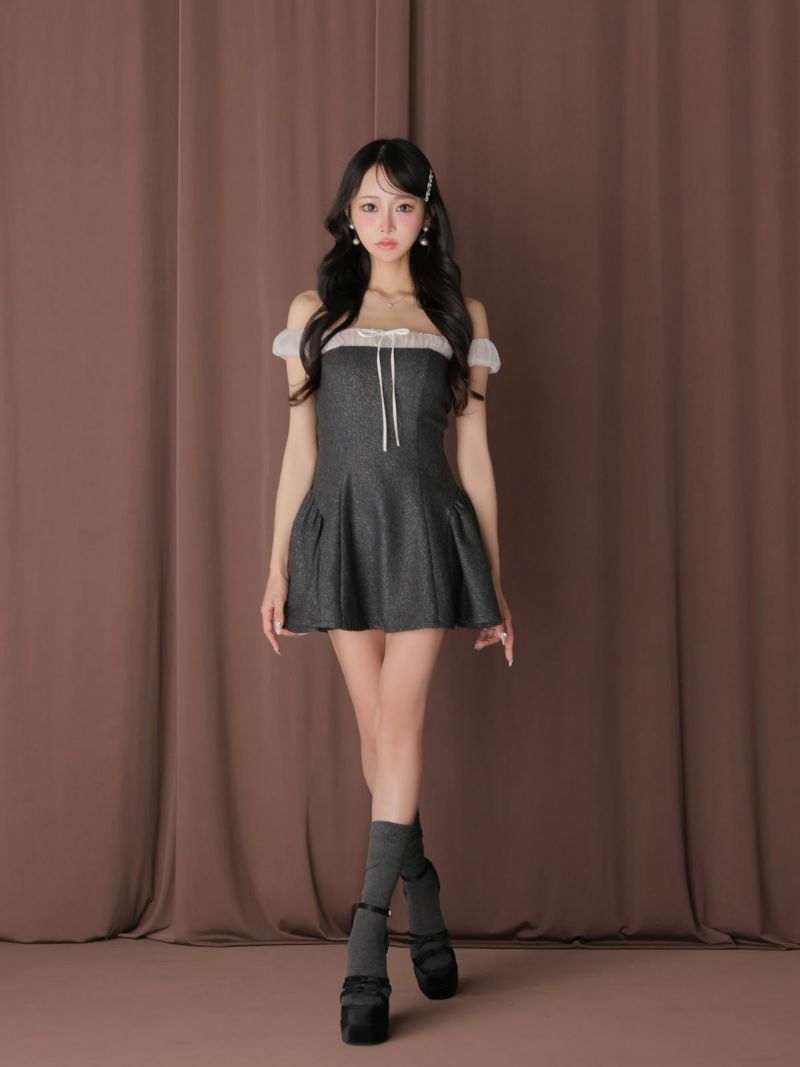 今っぽガーリードレス♡ [ANIER./アニエル] 高級 ブランド ワンピース Aラインミニドレス オフショルダー 胸元リボン シフォン切替 ラメ