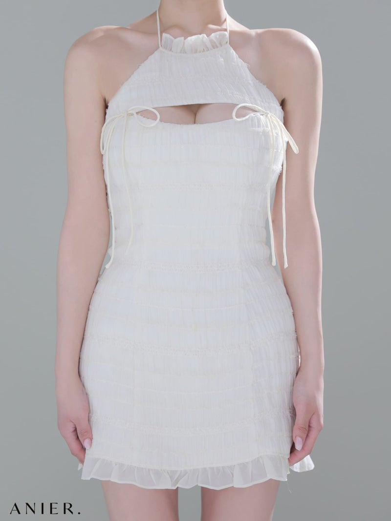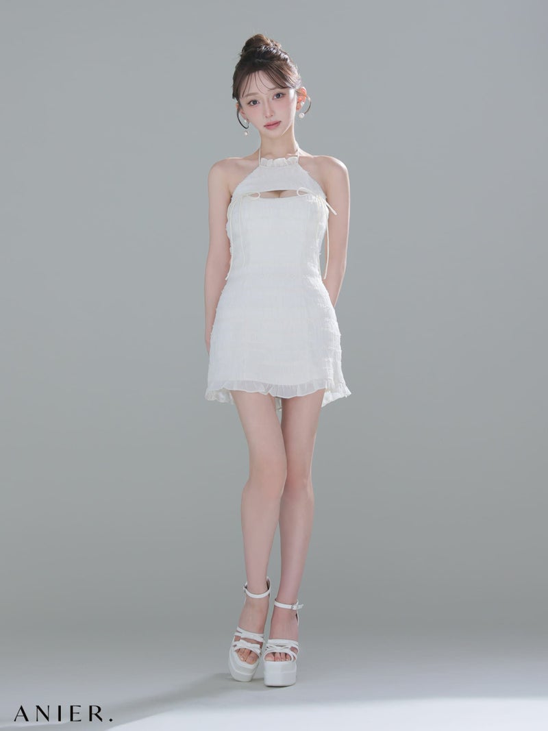 4. [ANIER./アニエル] 高級 ブランド タイトミニドレス ホルターネック 背中魅せ バストカット リボン シフォン フリル