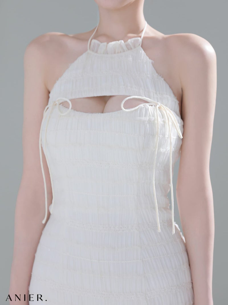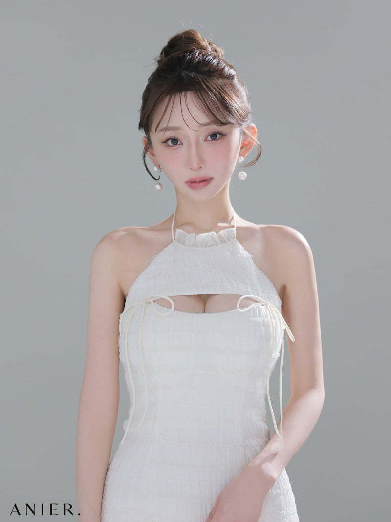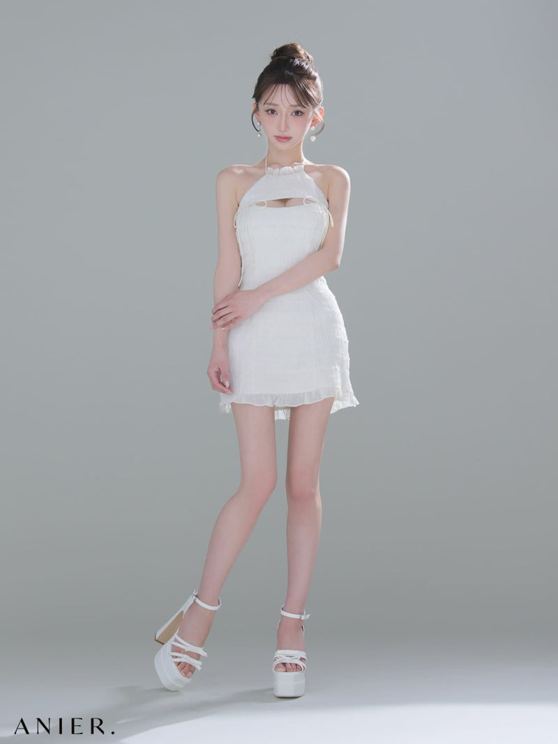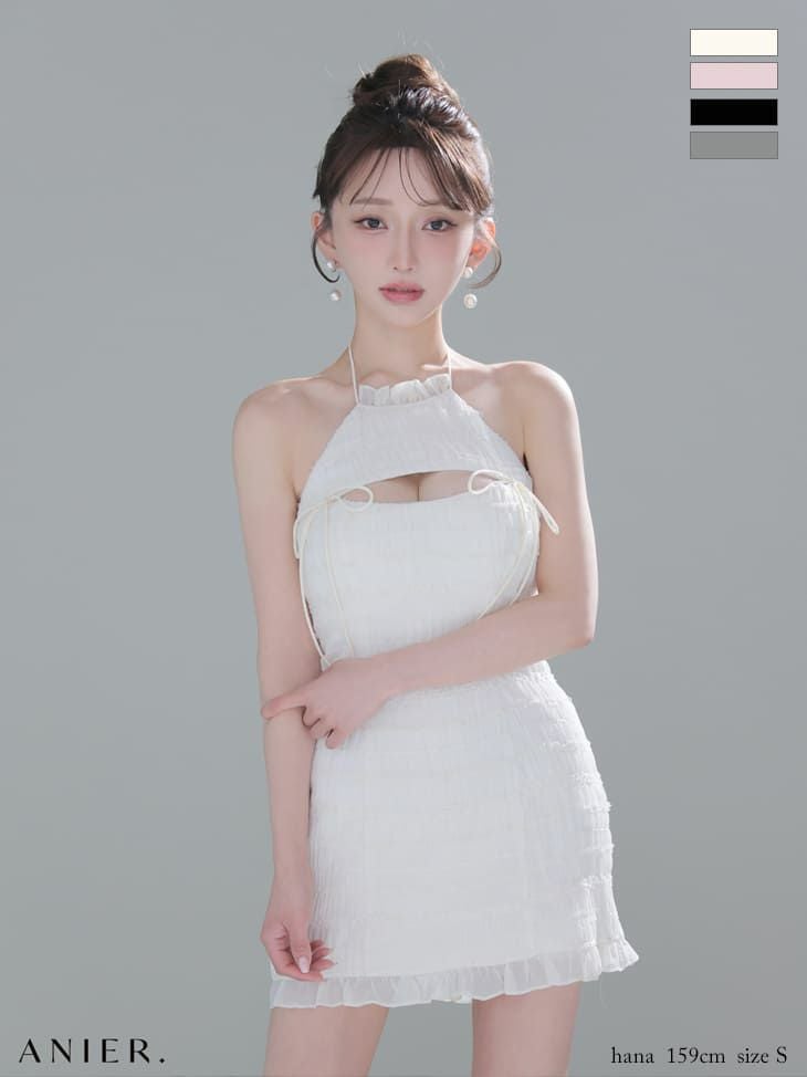 4. [ANIER./アニエル] 高級 ブランド タイトミニドレス ホルターネック 背中魅せ バストカット リボン シフォン フリル