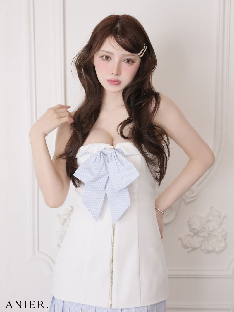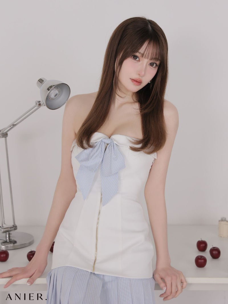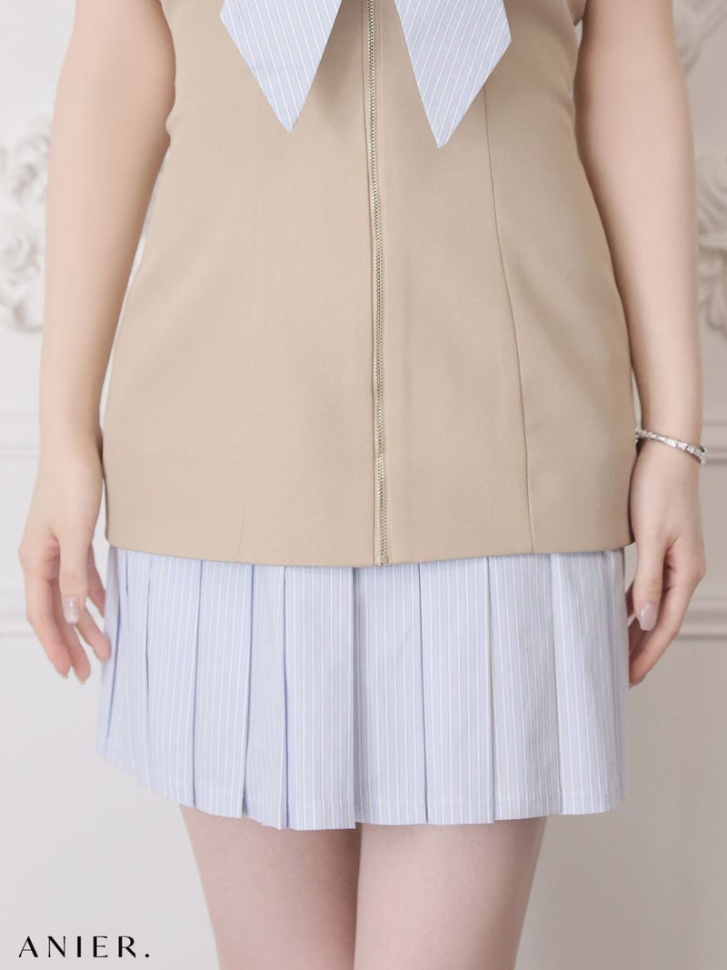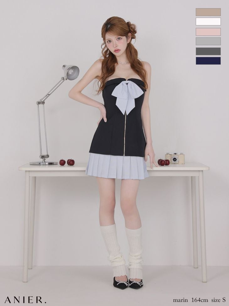5. [ANIER./アニエル] 高級 ブランド タイトミニドレス ベア バストリボン ジップ ストライプ バイカラー プリーツ