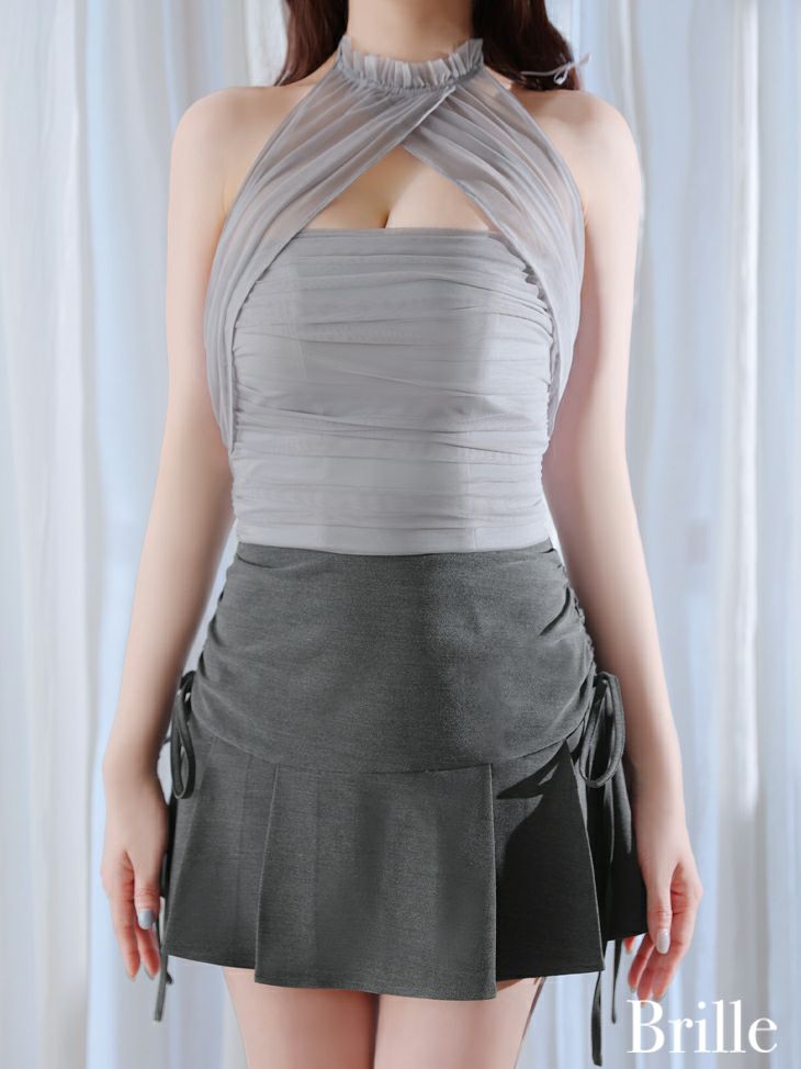 上品な肌見せを叶える♡ [Brille/ブリエ] 高級 ホルターネック チュール 背中魅せ セットアップ プリーツ リボン フレアミニドレス