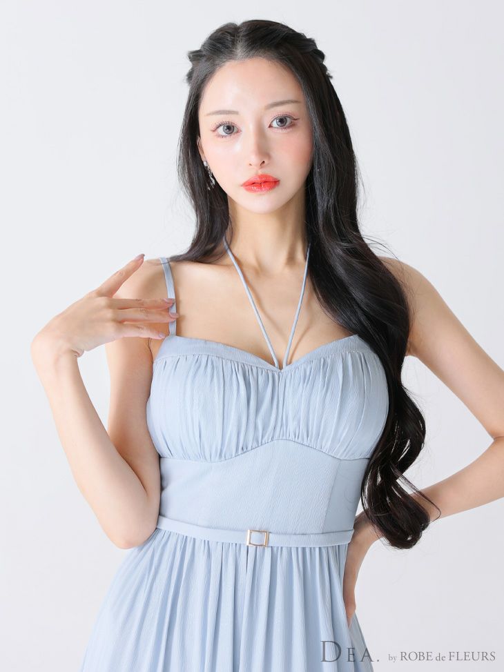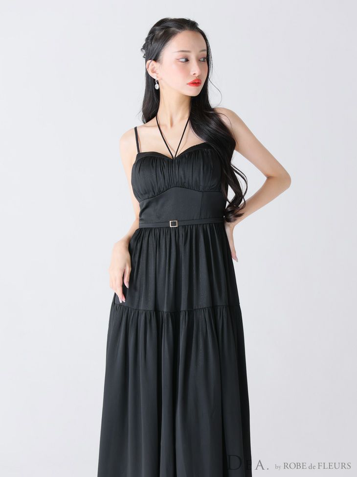 6. [DEA.byROBEdeFLEURS/ディアバイローブドフルール] 高級ホルターネックリボンキャミソールウエストベルトラメシフォンAラインロングドレス