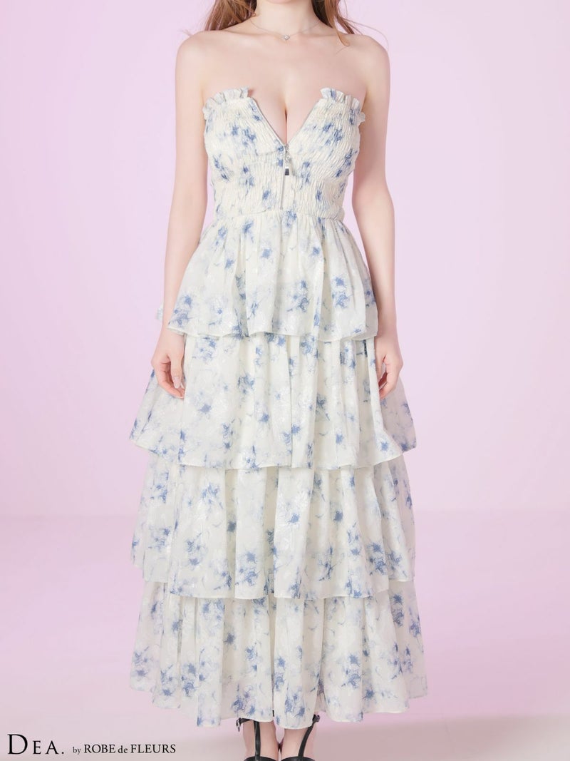 ベアでスッキリとした肌見せを叶える♡ [DEA.byROBEdeFLEURS/ディアバイローブドフルール] 高級 ブランド Aラインロングドレス 谷間 ベア ジップ フラワーシフォン ティアード