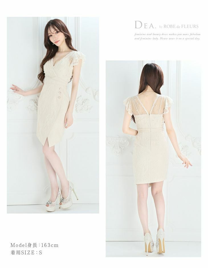 流れるレースデザインとパールでエレガントな印象に☆ [DEA.byROBEdeFLEURS/ディアバイローブドフルール] 高級アシンメトリーフリル袖×タイトミニドレス
